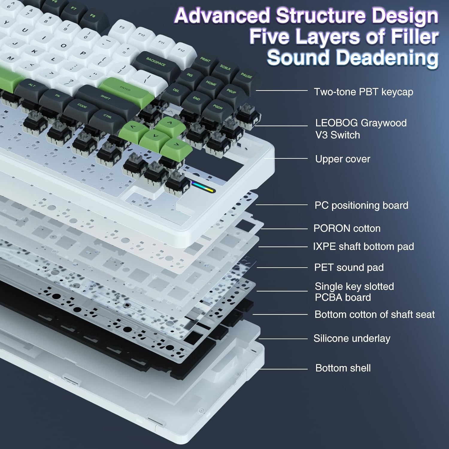 AULA F87 Wireless Tri-Mode Mechanical Gaming Keyboard | RGB | 87-Key TKL | Green White Graywood Switch