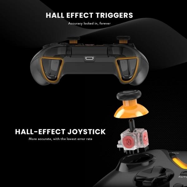 Hall-effect joystick and triggers for enhanced precision and longer life.